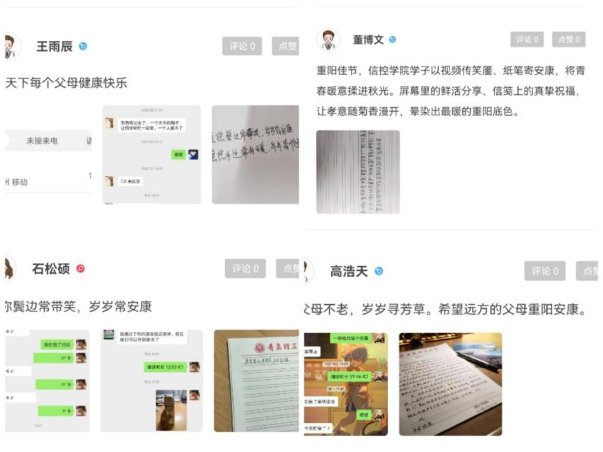 时光记忆传孝意,青春行动谱感恩。重阳节来临之际,学院依托“到梦空间”平台,发起“时光记忆”主题感恩行动,鼓励同学们记录并分享与长辈间的温暖瞬间:有人晒出写给父母的手写信,有人分享视频通话中的亲情互动,也有人回忆童年的幸福片段。学院精选优秀作品进行展示,带动更多同学主动与家人沟通交流,让“尊老敬亲、感恩陪伴”的理念在校园内延续。活动通过温情互动引导学生以行动诠释孝心、凝聚亲情,使敬老爱亲的传统美德在信控学子中生根发芽。